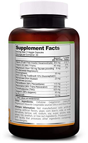 Age Defense with Sulforaphane precursors Glucoraphanin & Myrosinase, Healthy NAD+ with Apigenin, Niacin & TMG, Nrf2 & Sirtuin activators Pterostilbene, Trans-Resveratrol, Vitamin K2, Magnesium