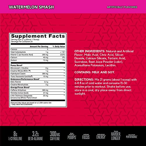 Specification: BSN N.O.-XPLODE Vaso Pre Workout Powder with 8g of L-Citrulline and 3.2g Beta-Alanine and Energy, Flavor: Watermelon Smash, 24 Servings