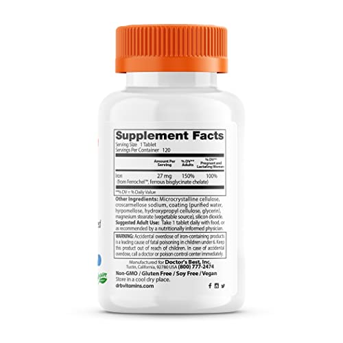 Specification: Doctor’s Best High Absorption Iron with Ferrochel, Gentle on The Stomach, Immune Health, Blood Health, 27 mg
