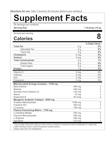 Each gummy is a powerhouse, containing a potent blend of 5 grams of essential ingredients, including Beta Alanine, Huperzine A, Creatine, L-Citrulline, Glycerol Monostearate, L-Arginine, and Agmatine. With every chew, you’ll elevate your workout with increased strength, extended endurance, and the ultimate pump that screams success.