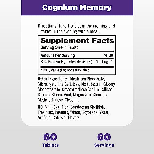 Specification: Natrol Cognium Memory, 100mg Silk Protein Hydrosate, 60 Tablets, 30 Servings, Brain Health Support, Keeps Memory Strong, Clinically Shown to Improve Memory and Recall in Healthy Adults, Stimulant Free