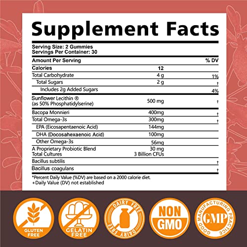 [NATURAL BRAIN ENHANCER] – We took all of the brain-boosting benefits from Phosphatidylserine (from sunflower lecithin), Bacopa Monnier, and Omega 3s (from wild-caught small fish) and packed them into all-natural, delicious, and vegan-friendly gummies. These brain booster supplements are proven to help stay focused and alert, enhance memory and concentration, and improve cognitive function, and mental processing speed.